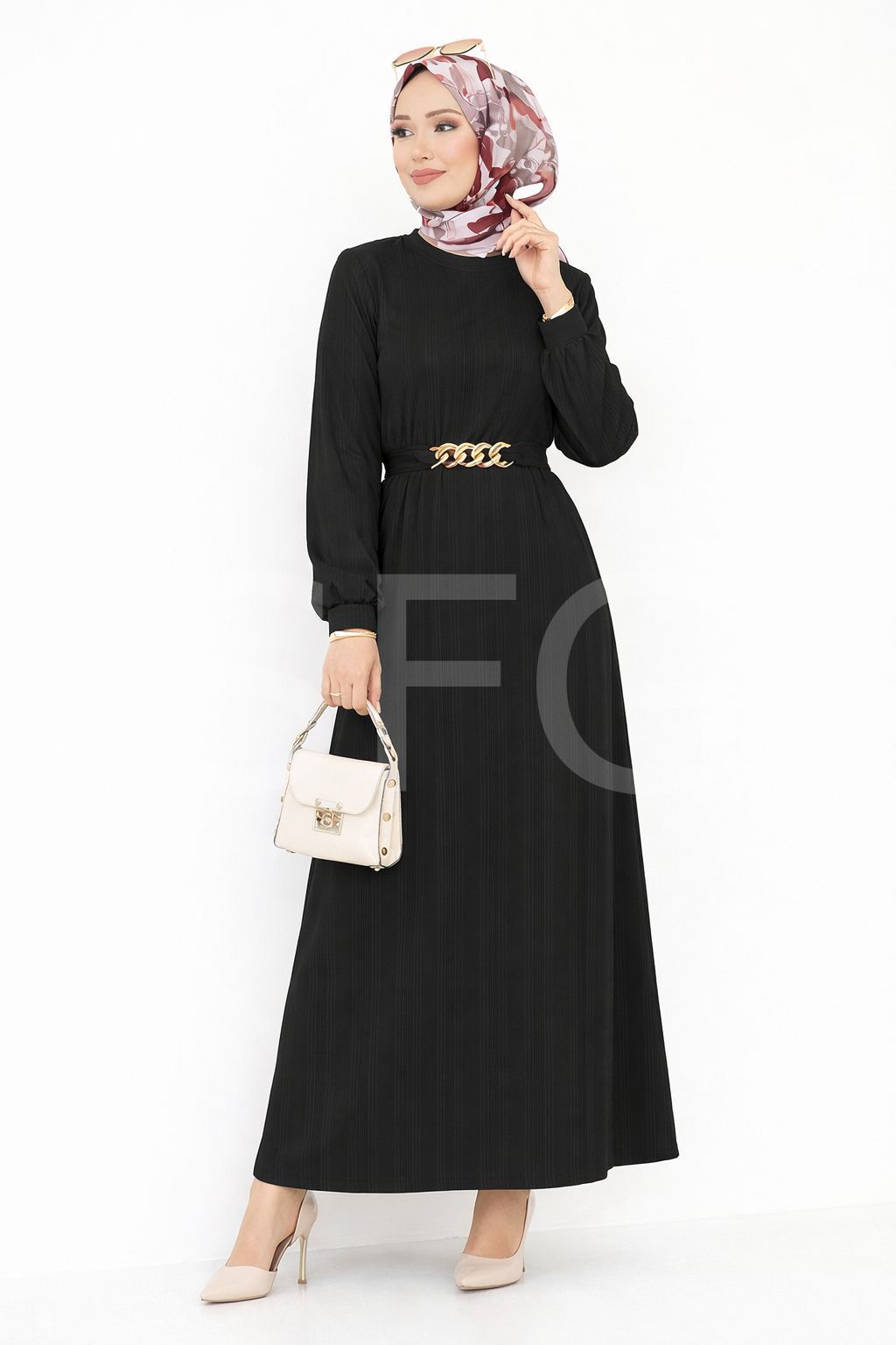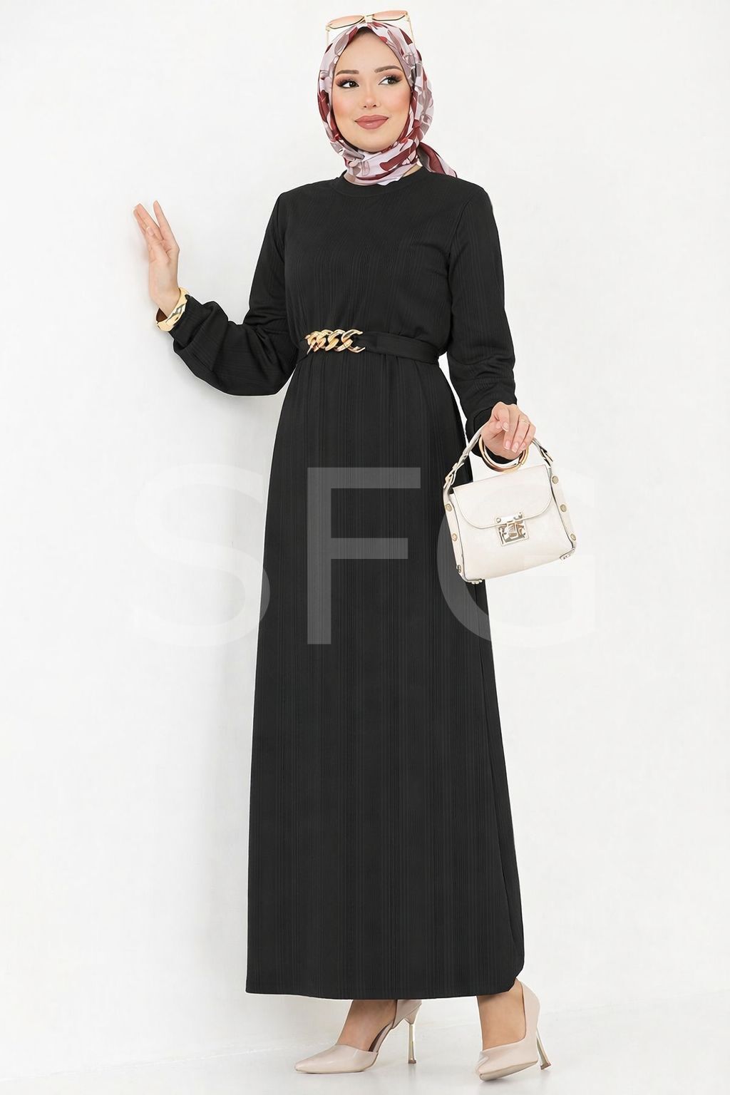 Kadın Gold Zincir Kemer Detaylı Bisiklet Yaka Burgu Elbise (5'li)