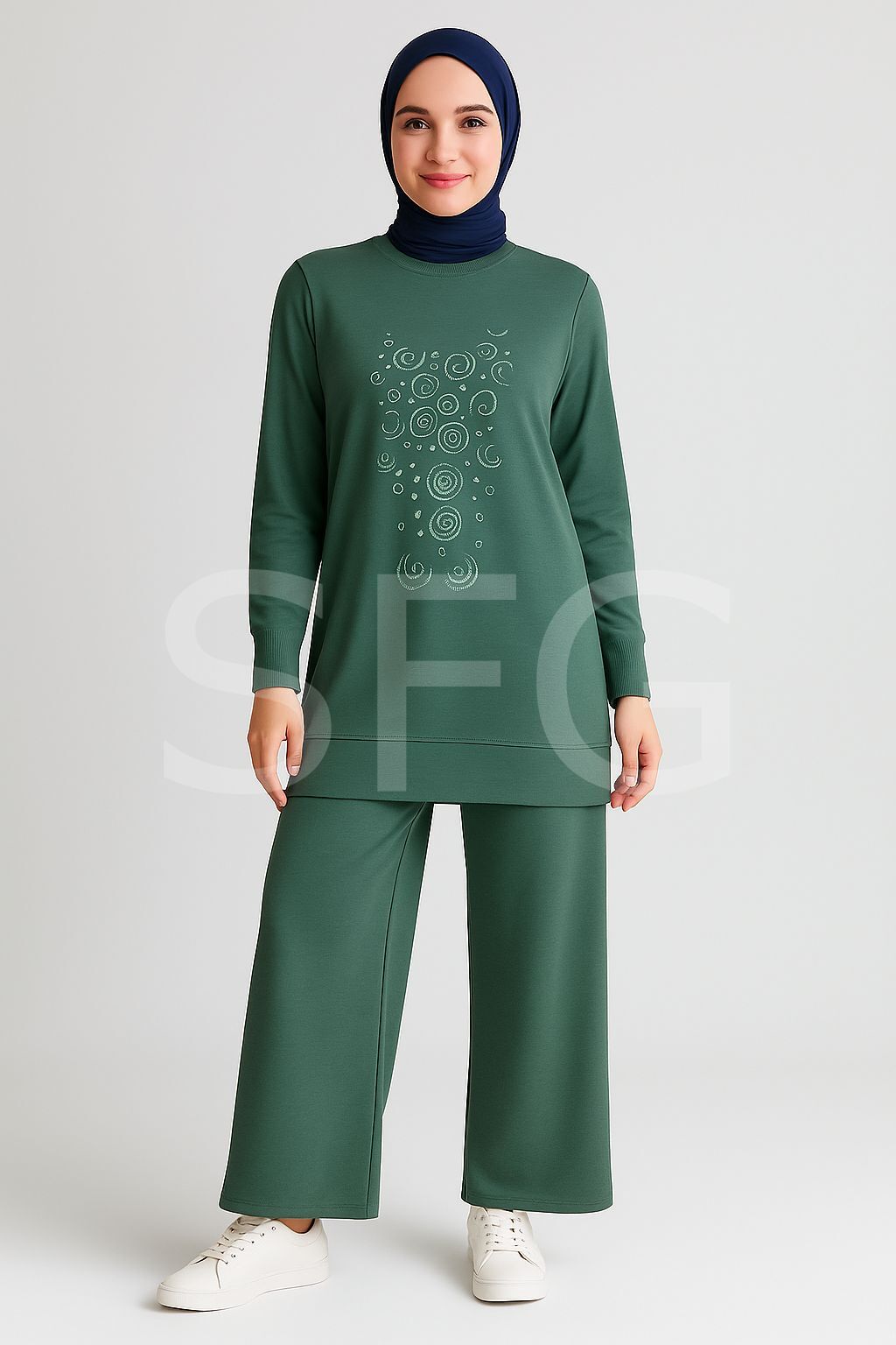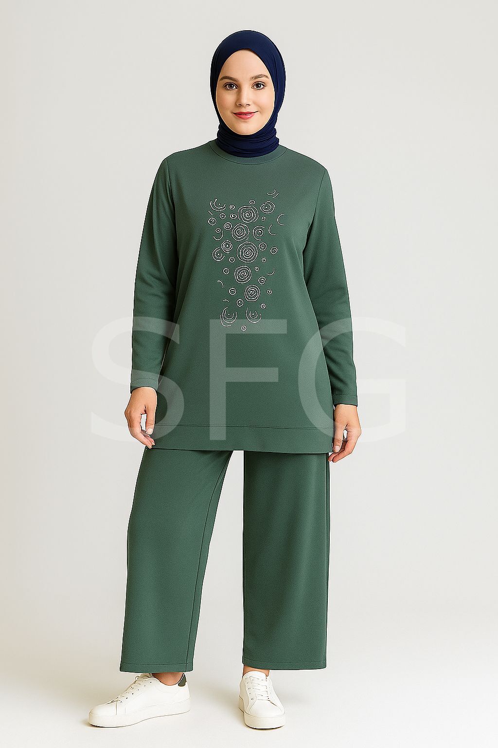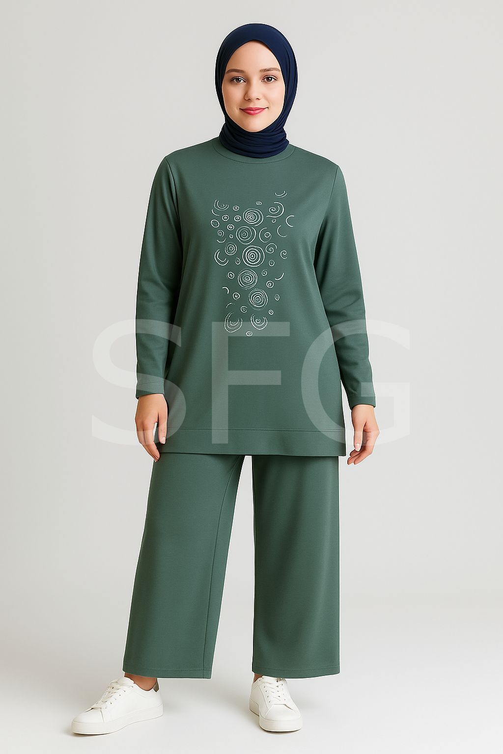 Zarif tasarımı ve rahat kalıbıyla öne çıkan bu taş detaylı ikili takım, şıklık ve konforu bir arada sunar.; Üst kısmında yer alan zarif taş işlemeler, tasarıma modern ve göz alıcı bir dokunuş katarken, tunik boyu sayesinde vücut hatlarını zarifçe örter.; Geniş paça pantolon, gün boyu rahat hareket etmenizi sağlar.; Günlük kullanımdan özel davetlere kadar her ortamda stilinizi tamamlayacak bu takım, şık görünüm arayanlar için ideal bir seçimdir.