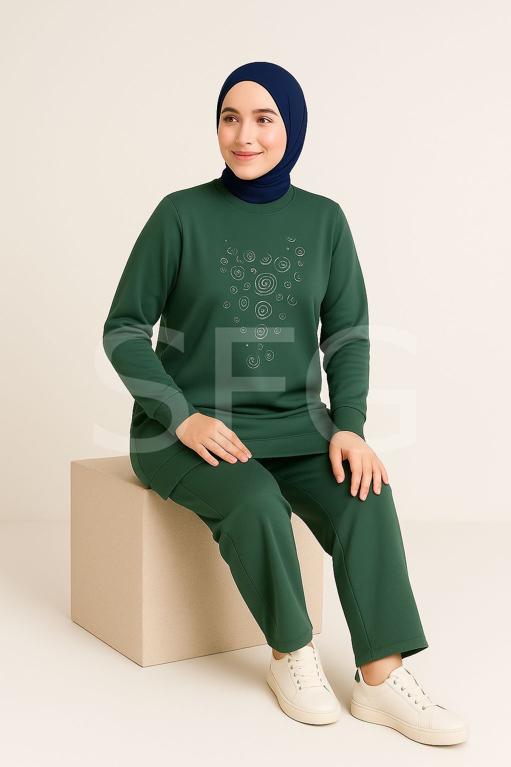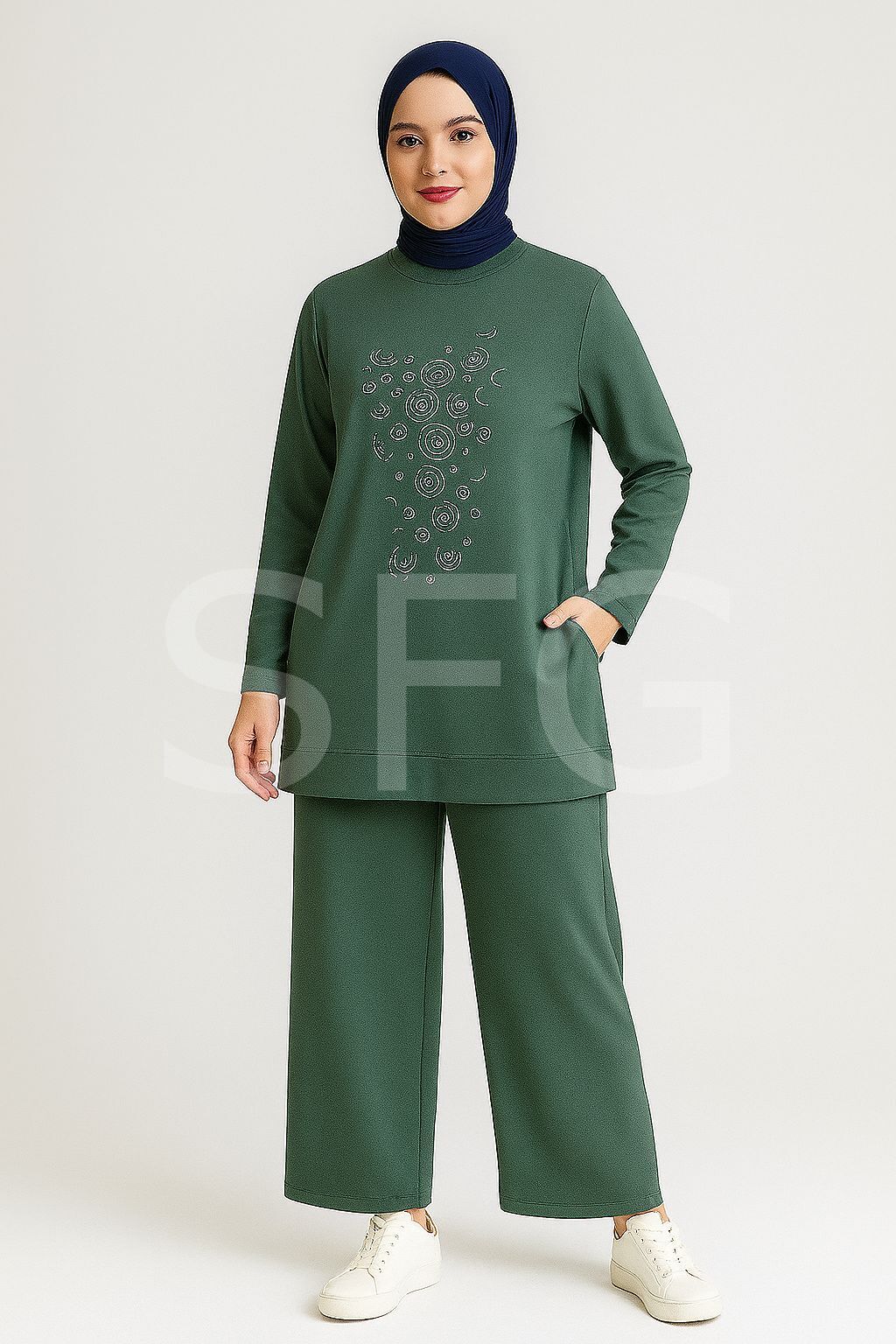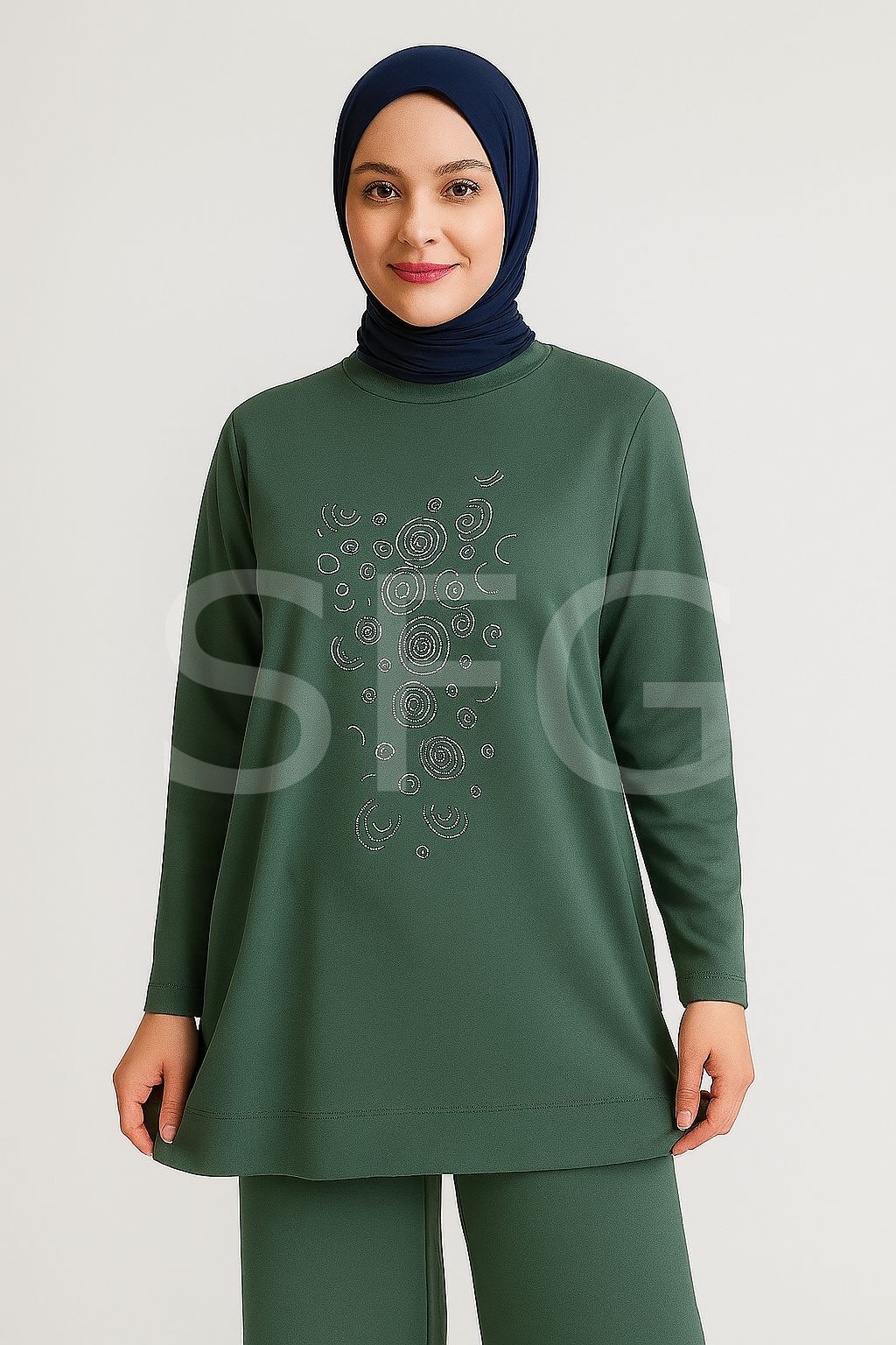 Zarif tasarımı ve rahat kalıbıyla öne çıkan bu taş detaylı ikili takım, şıklık ve konforu bir arada sunar.; Üst kısmında yer alan zarif taş işlemeler, tasarıma modern ve göz alıcı bir dokunuş katarken, tunik boyu sayesinde vücut hatlarını zarifçe örter.; Geniş paça pantolon, gün boyu rahat hareket etmenizi sağlar.; Günlük kullanımdan özel davetlere kadar her ortamda stilinizi tamamlayacak bu takım, şık görünüm arayanlar için ideal bir seçimdir.