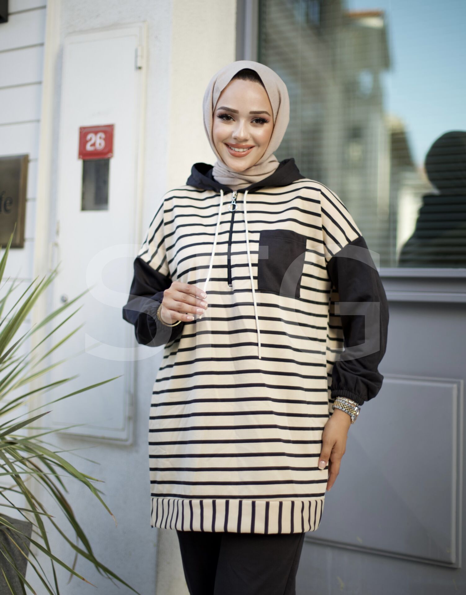 Kadın Kapüşonlu ve Önü Yarım Fermuarlı Çizgili 2 İplik Pantalon İle Tunik Takım(4ADET)