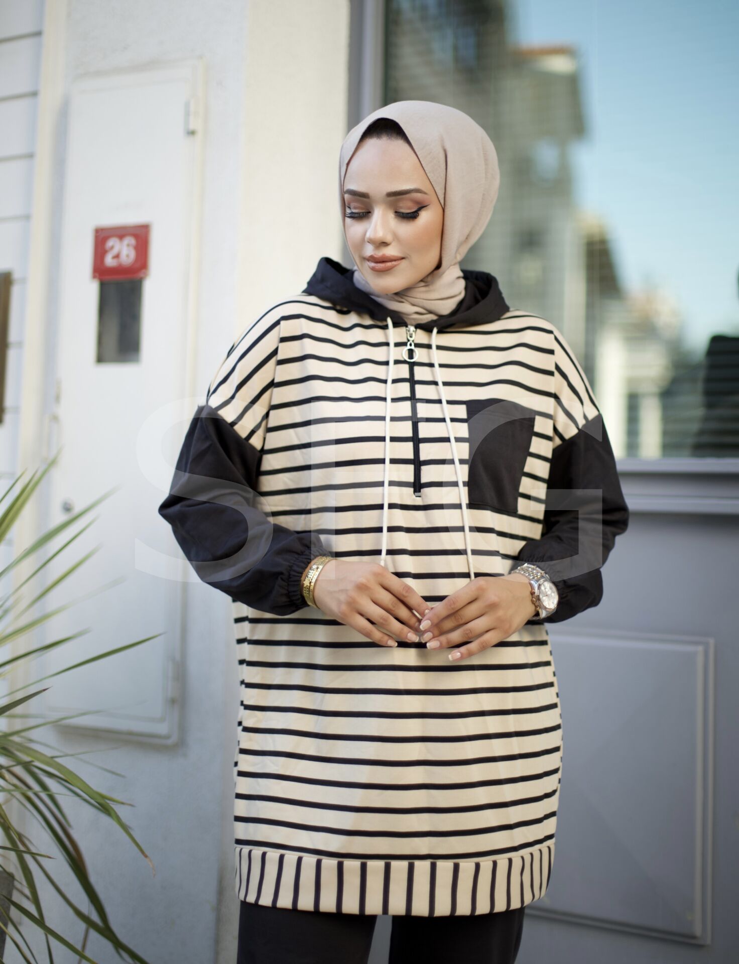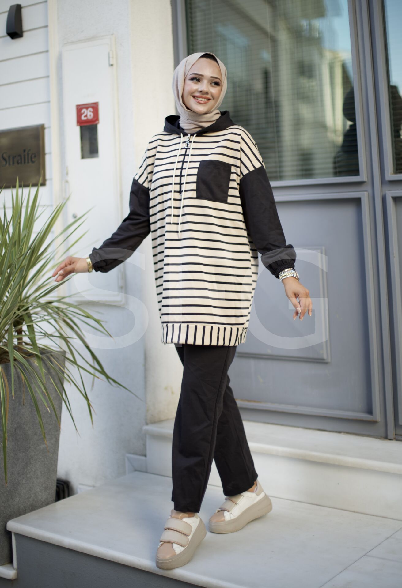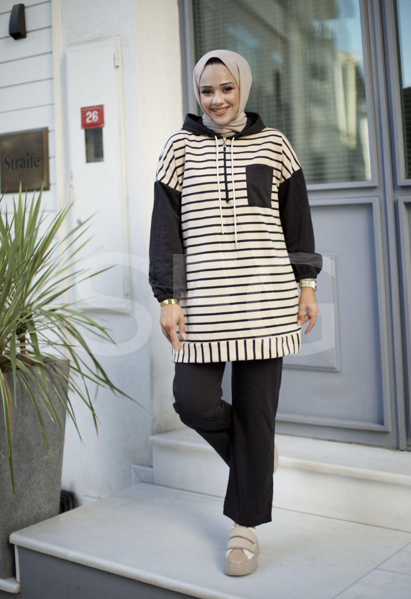 Kapüşonlu tasarımı ile hem şık hem de pratik bir kullanım sunar, günlük kullanıma uygun rahatlığıyla dikkat çeker; Dokuma kumaş yapısı sayesinde dayanıklılık ve konforu bir arada sunar, uzun süreli kullanımlarda bile formunu korur; Tunikli pantolonlu alt; üst takım kombini, modern ve şık bir görünüm sağlar; büyük beden kalıbı ile her vücut tipine uyum sağlar; Uzun kollu tasarımı ile mevsim geçişlerinde ideal koruma ve stil sunarken, standart kol tipi rahat hareket etme olanağı tanır; Yıkama talimatlarına uygun şekilde bakım yapıldığında maksimum 30 derece sıcaklıkta yıkama imkanı sunarak kolay bakım avantajı sağlar; Tesettür giyim koleksiyonuna özel olarak tasarlanmış bu takım, trend çizgili deseniyle modern bir dokunuş katarken tüm yaş gruplarına hitap eder; Pamuklu materyal bileşeni cildin nefes almasını sağlayarak gün boyu konforlu bir deneyim sunar; orta kalınlıkta dokusuyla mevsim geçiş;
