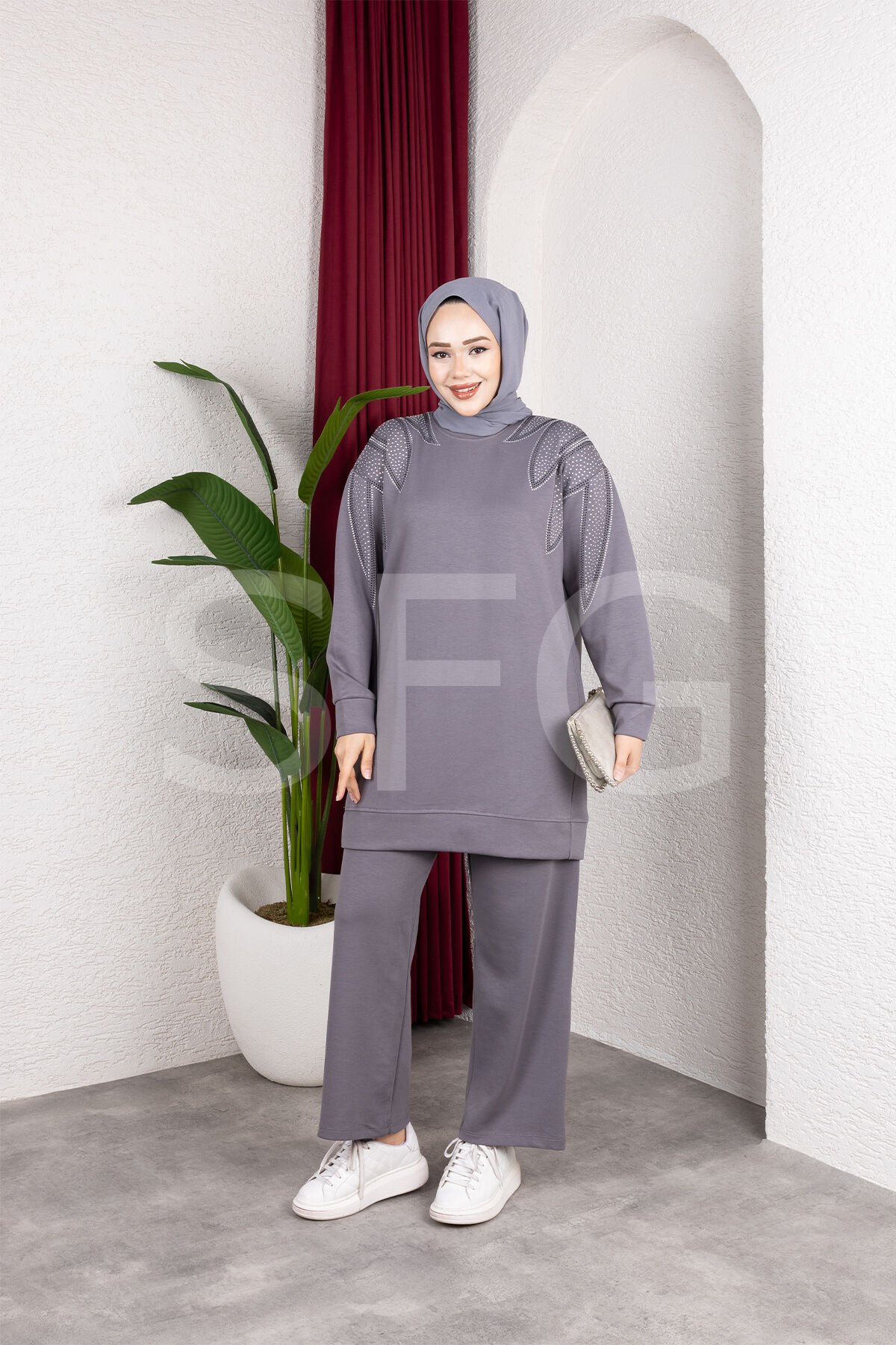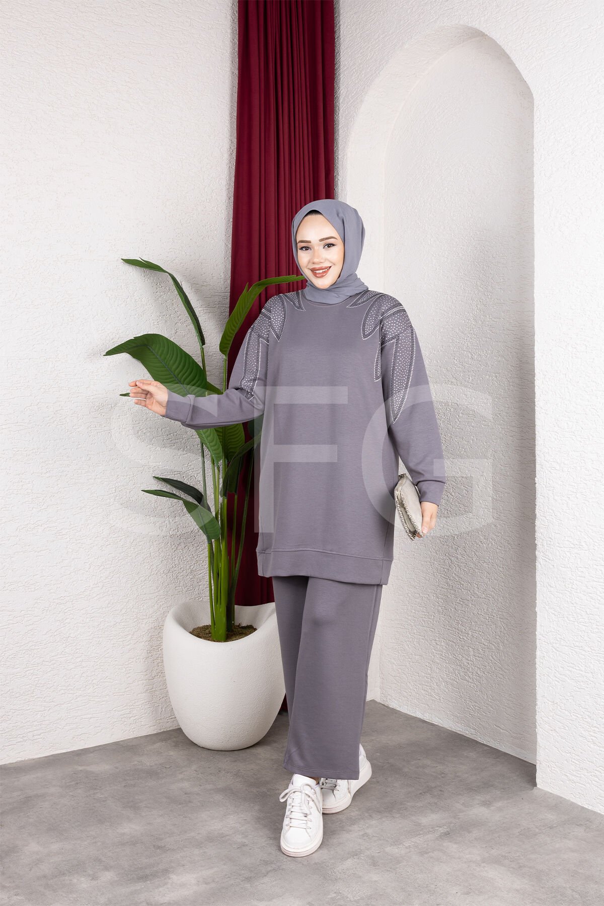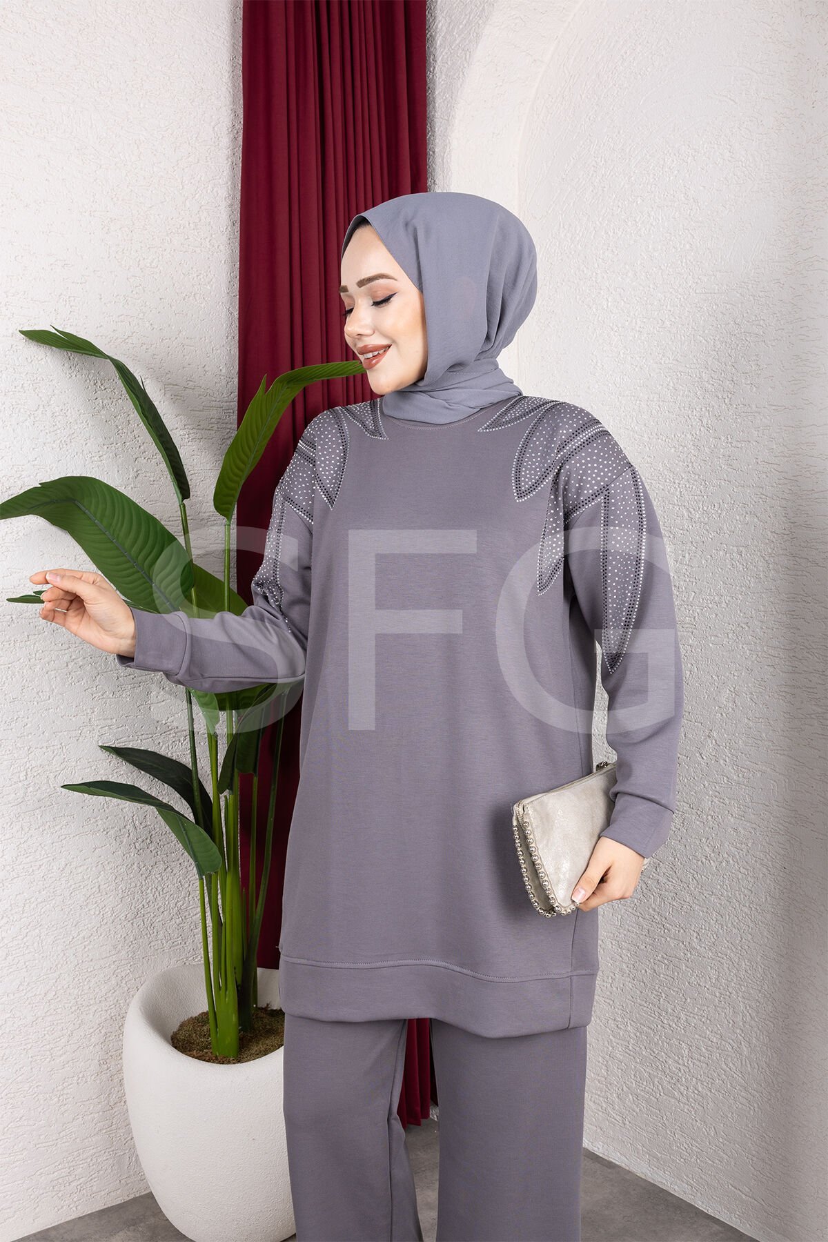 Zarif tasarımı ve rahat kalıbıyla öne çıkan bu taş detaylı ikili takım, şıklık ve konforu bir arada sunar.; Üst kısmında yer alan zarif taş işlemeler, tasarıma modern ve göz alıcı bir dokunuş katarken, tunik boyu sayesinde vücut hatlarını zarifçe örter.; Geniş paça pantolon, gün boyu rahat hareket etmenizi sağlar.; Günlük kullanımdan özel davetlere kadar her ortamda stilinizi tamamlayacak bu takım, şık görünüm arayanlar için ideal bir seçimdir.
