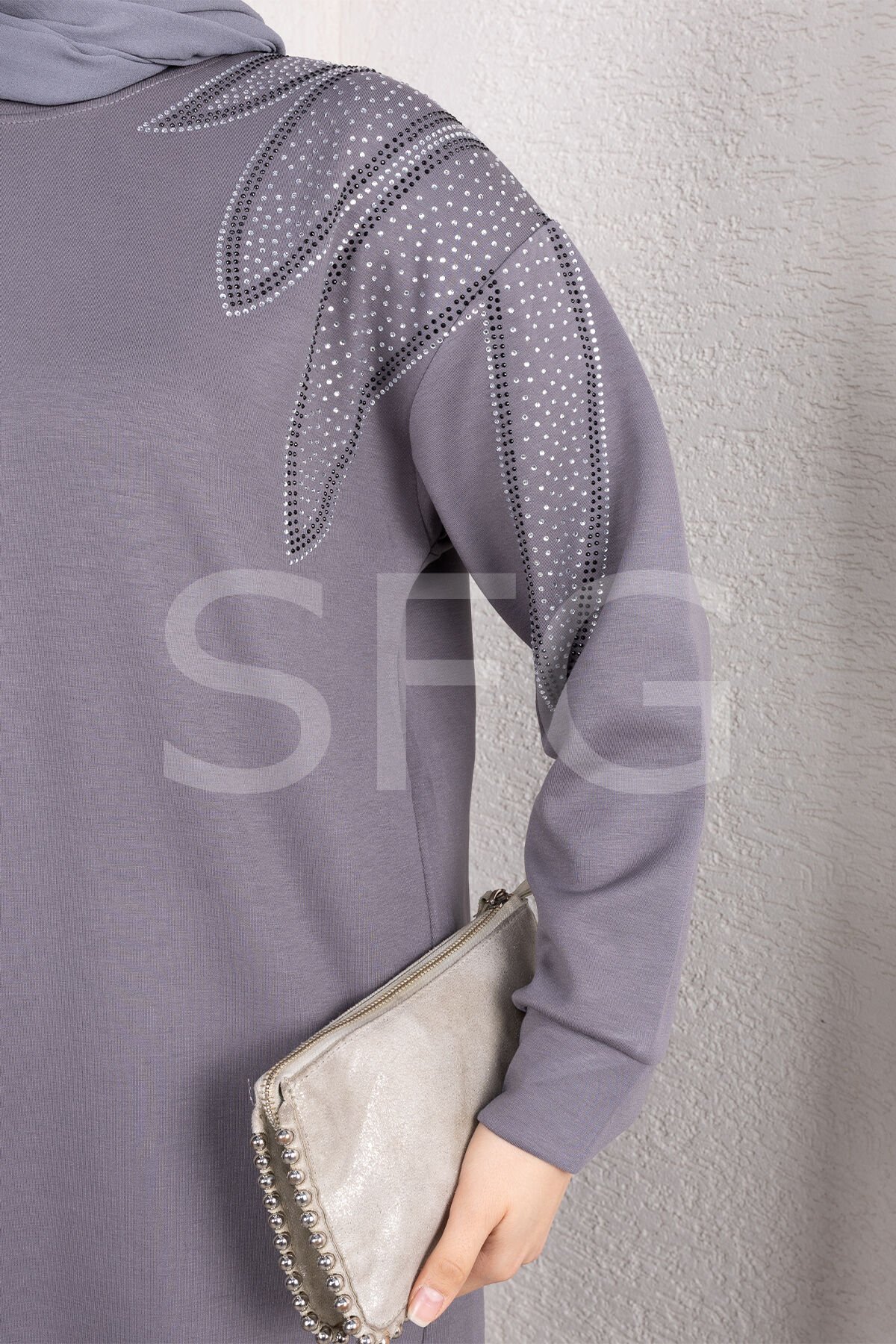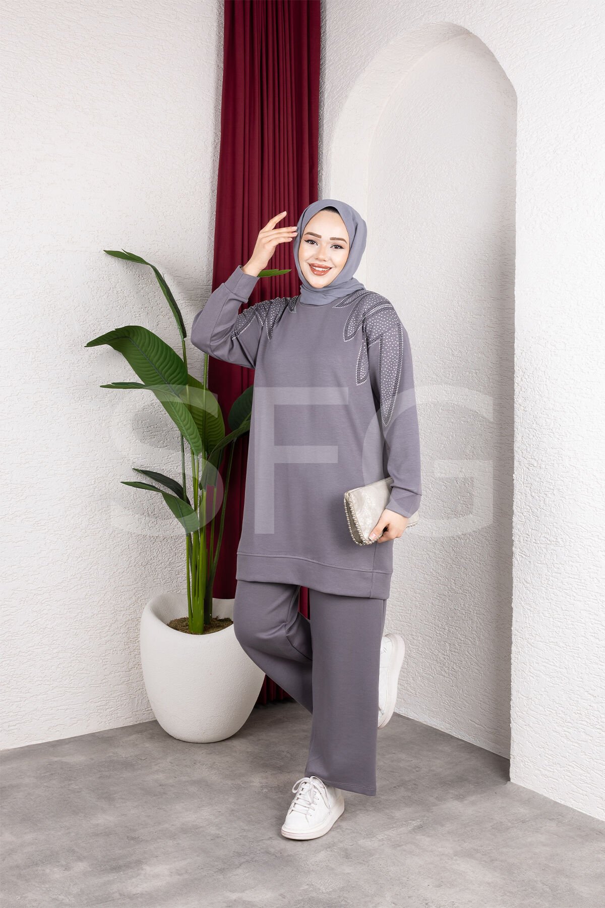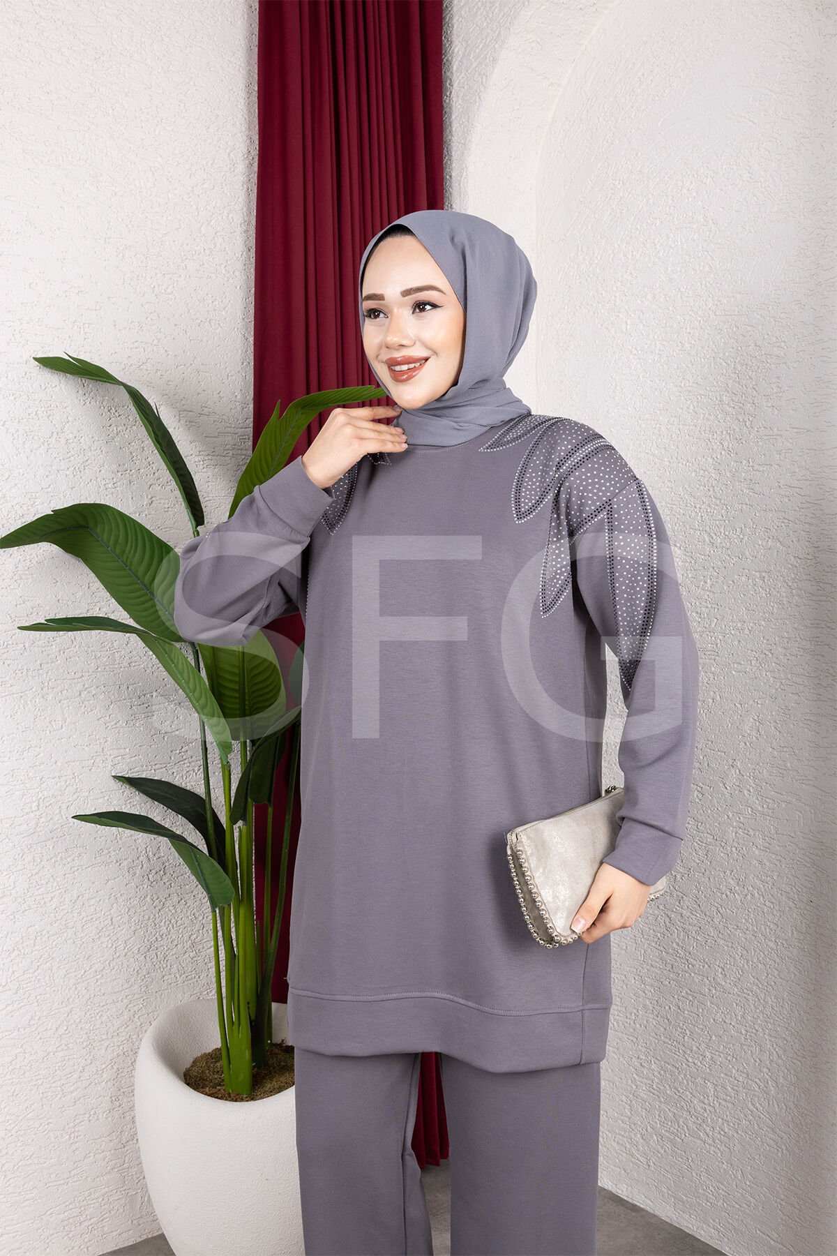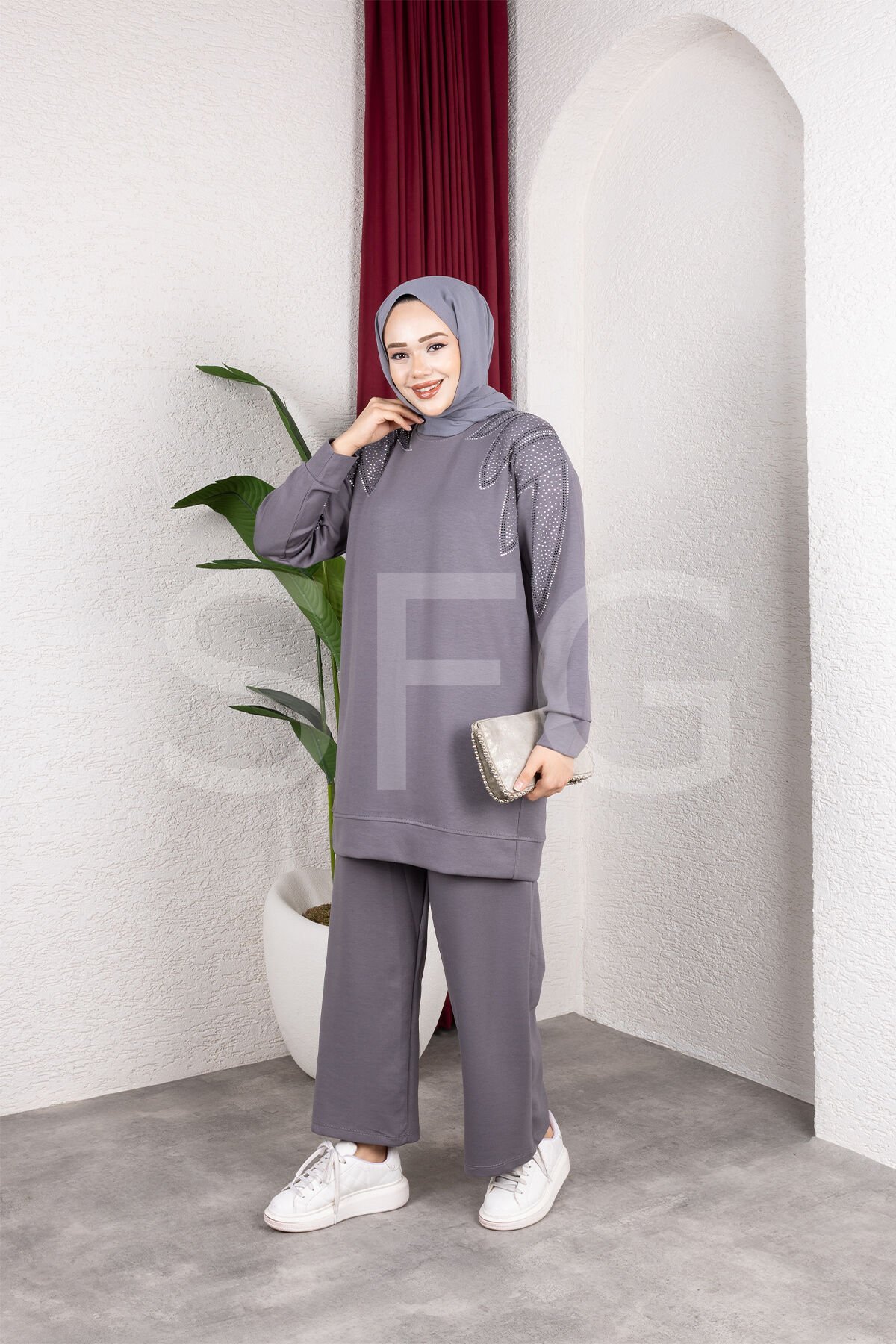Zarif tasarımı ve rahat kalıbıyla öne çıkan bu taş detaylı ikili takım, şıklık ve konforu bir arada sunar.; Üst kısmında yer alan zarif taş işlemeler, tasarıma modern ve göz alıcı bir dokunuş katarken, tunik boyu sayesinde vücut hatlarını zarifçe örter.; Geniş paça pantolon, gün boyu rahat hareket etmenizi sağlar.; Günlük kullanımdan özel davetlere kadar her ortamda stilinizi tamamlayacak bu takım, şık görünüm arayanlar için ideal bir seçimdir.