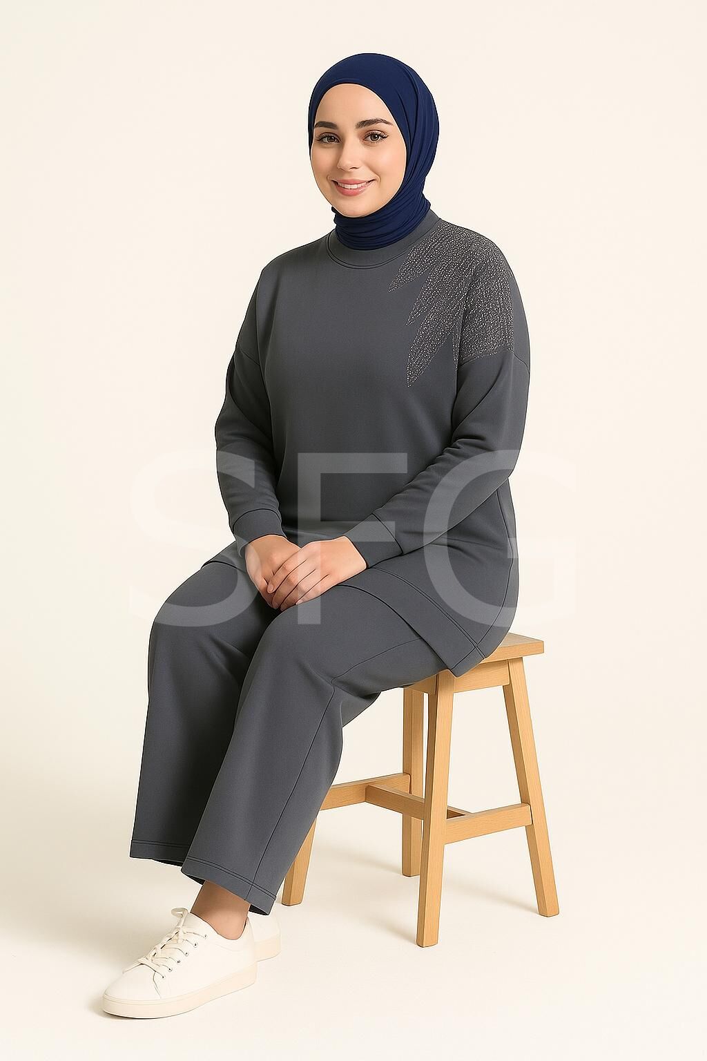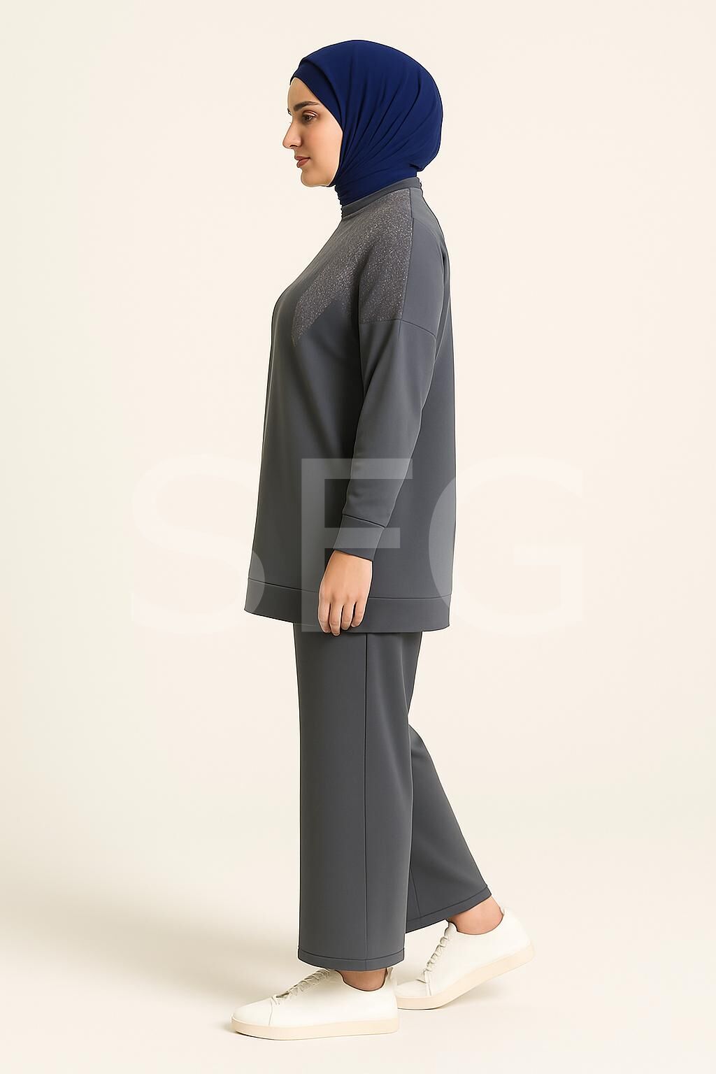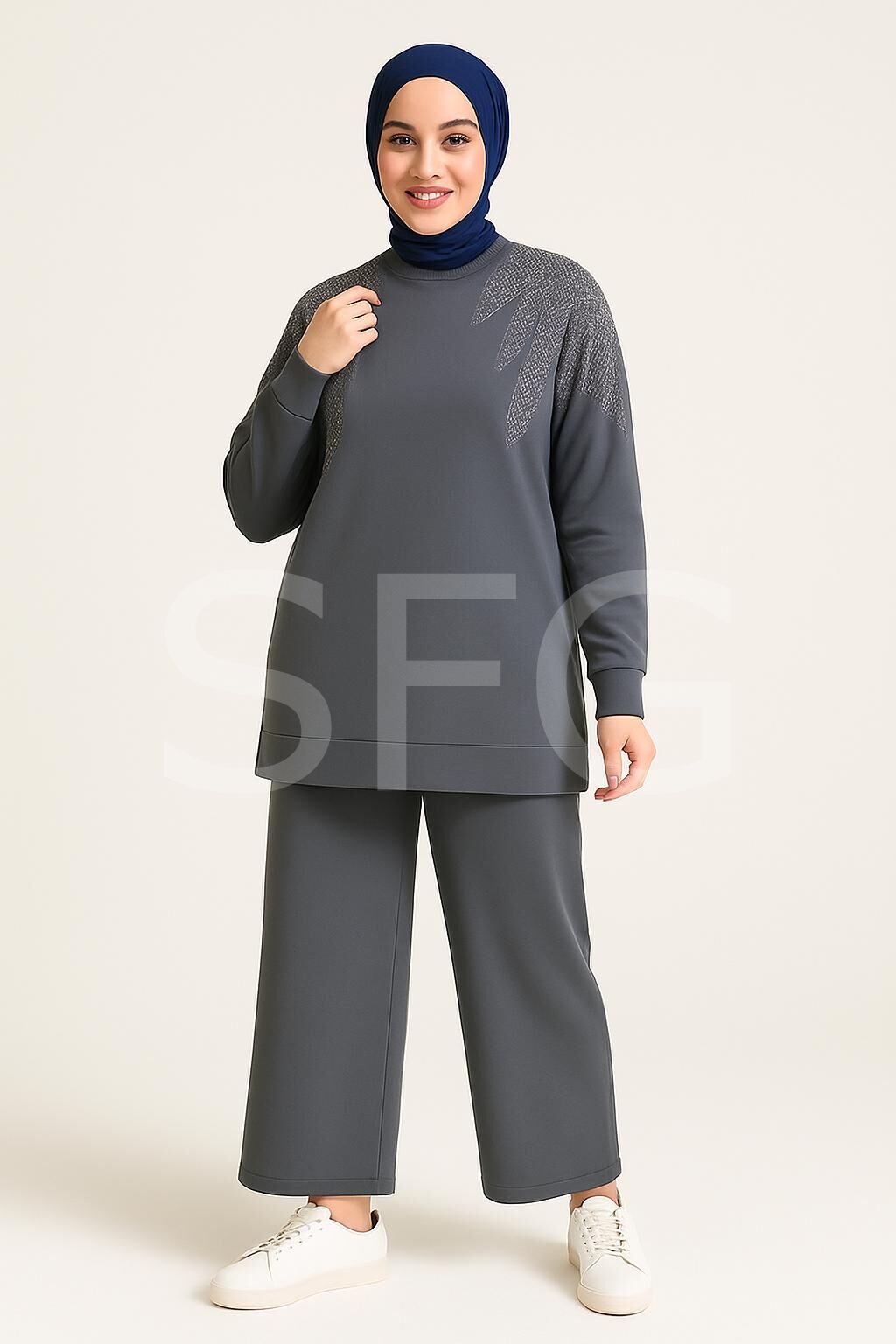 Kadın Lacivert Tesettür Giyim Zarif Taş Detaylı Tunik & Pantolon İkili Takım ( 4'LÜ )