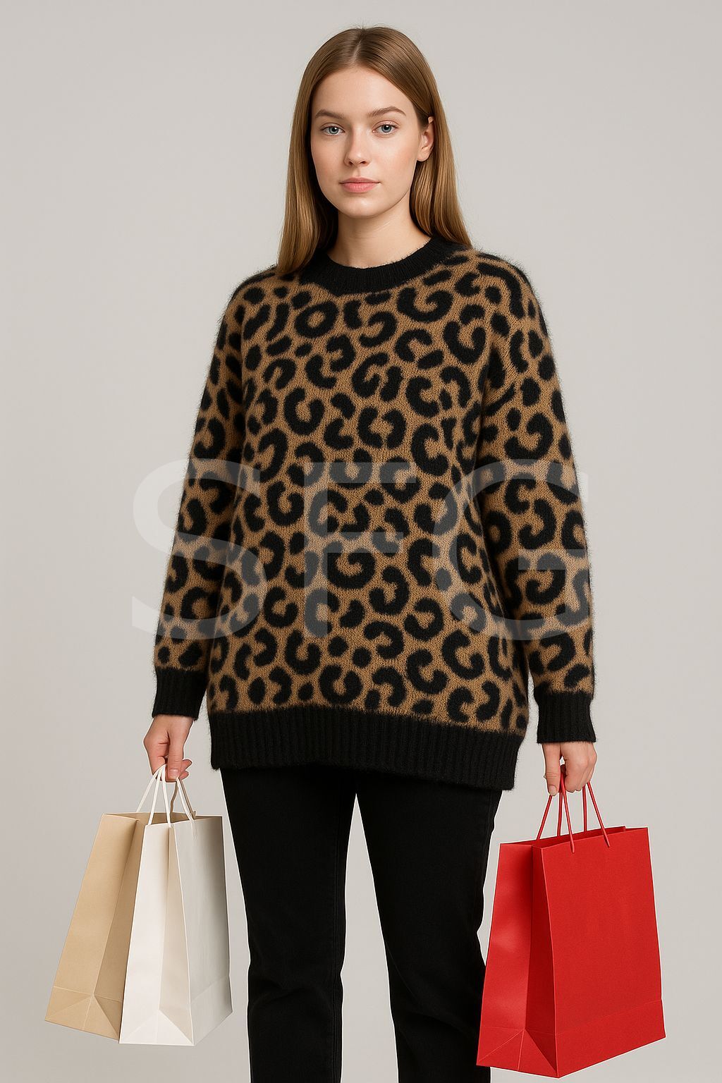 Kadın Leopar Desenli Ve Şardonlu Oversize Kazak (2'li)