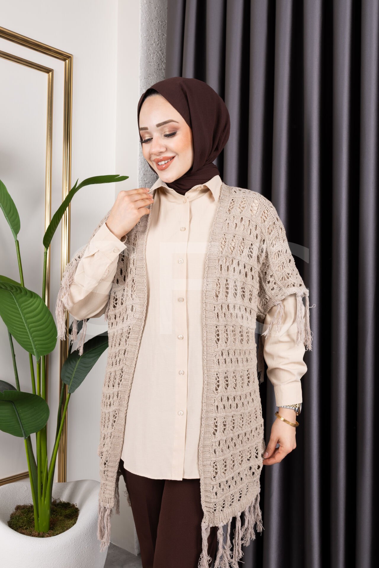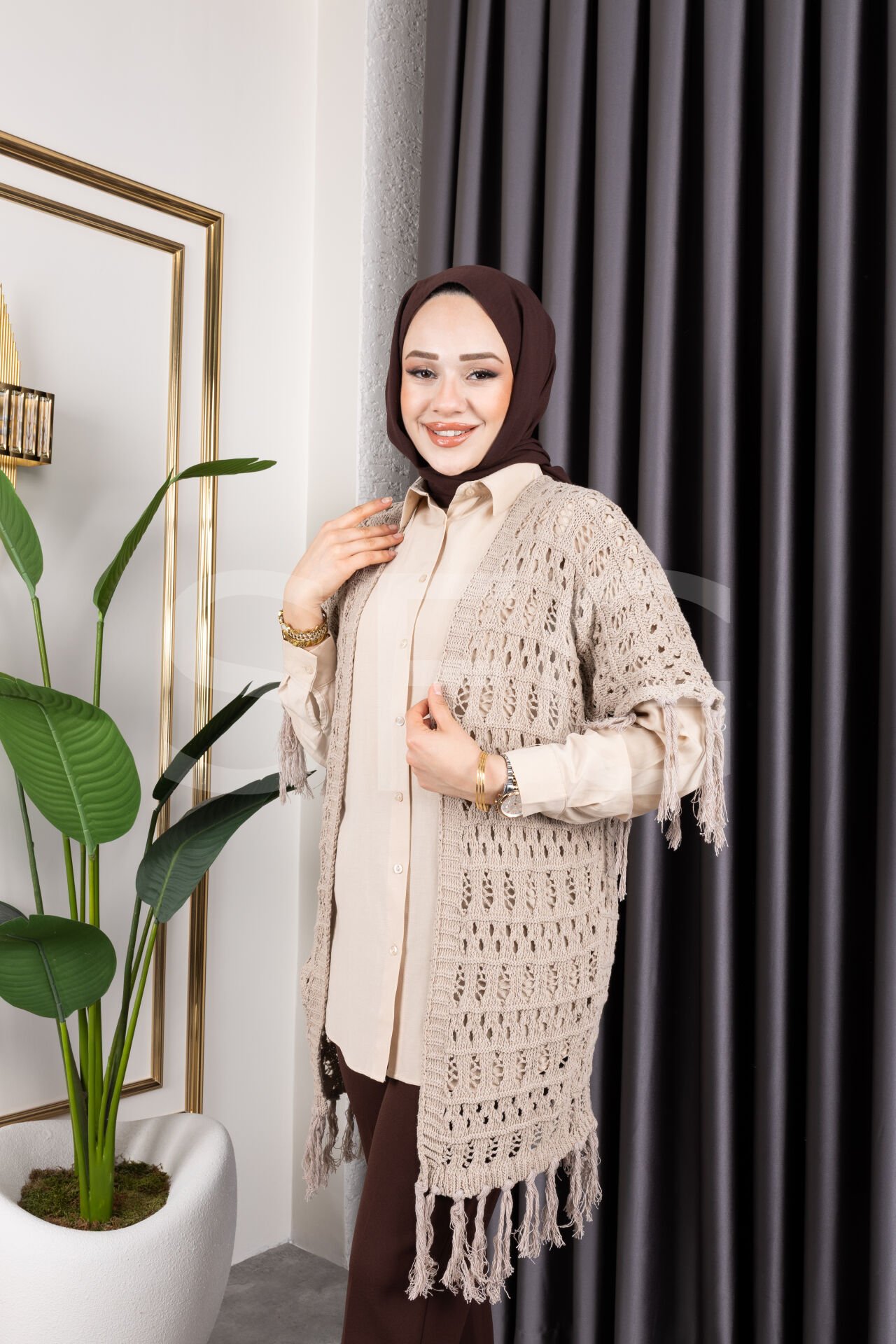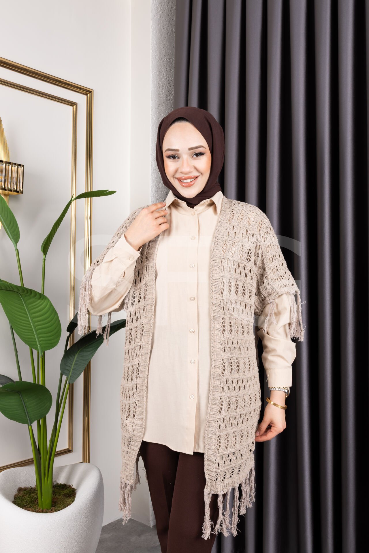 - %100 pamuk materyali ile üretilmiş, cildinize nefes aldıran ve gün boyu konfor sunan bir hırka.; - Mevsim geçişlerinde ideal kullanım sağlayan orta kalınlıkta örgü dokusuyla sıcak tutar.; - Trend bir görünüm kazandıran saçaklı detayları ve ajurlu deseniyle stil sahibi kombinlerin vazgeçilmezi.; - Kemersiz tasarımı sayesinde rahat bir kullanım sunarken, püskül detaylarıyla şık bir dokunuş katıyor.; - Baskısız baskı teknolojisiyle sade ve zamansız bir tarz yaratırken, plaj tekstil koleksiyonunun parçası olarak yazlık gardırobunuzda yerini alıyor.; - Kolay bakım imkanı sağlayan maksimum 30 derecede yıkama talimatına uygun şekilde temizlenebilir.; - Cepsiz yapısıyla minimalist bir görünüm sergileyen bu hırka, günlük kullanım için idealdir.; - Tüylenmeye karşı dayanıklı kumaşı sayesinde uzun süre ilk günkü gibi kalır ve formunu korur.; - Genç yaş grubuna hitap eden dinamik tasarım anlayışıyla genç kadınların enerjisini yansıtır.; - Standart kol tipiyle hareket özgürlüğünüzü kısıtlamadan konforlu bir deneyim sağlar.; - Kapamasız yapısıyla modern ve minimalist çizgiler taşıyan bu hırka, her tür alt giysiyle kolayca kombinlenebilir.; - Triko kumaşın sunduğu yumuşaklık ve dayanıklılıkla her mevsim tercih edilebilecek çok yönlü bir üründür.; - Türkiye'de üretilmiş olup kalite standartlarına uygun üretim sürecinden geçmiştir.; - Ajurlu deseniyle hafif ve ferah hissettiren bu hırka, yaz aylarında bile serin tutacak yapıdadır.; - Şal yakası sayesinde boynunuza zarif bir şekilde otururken aynı zamanda rahatlık sunar.; - Uzun kol boyu mevsimsel geçişlerde ideal koruma sağlarken, oversize kesimiyle trend bir siluet çizer.