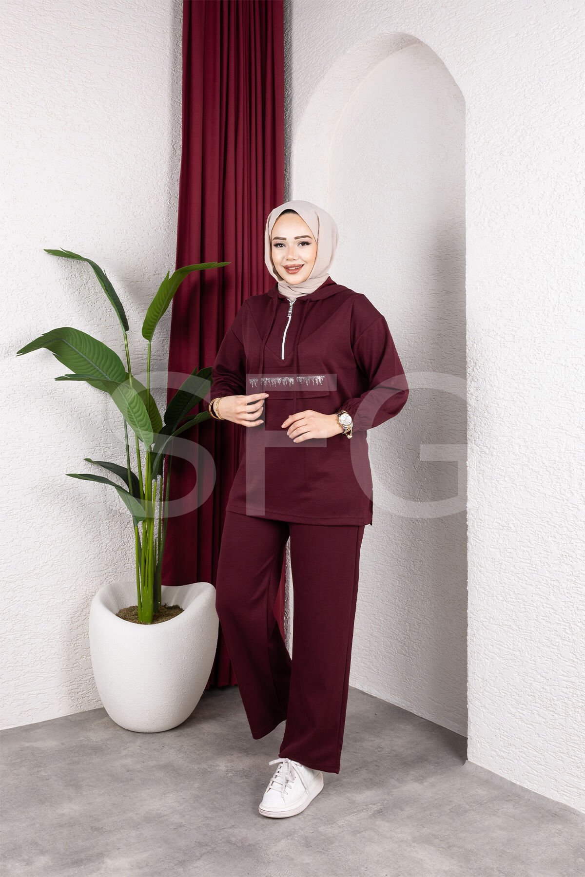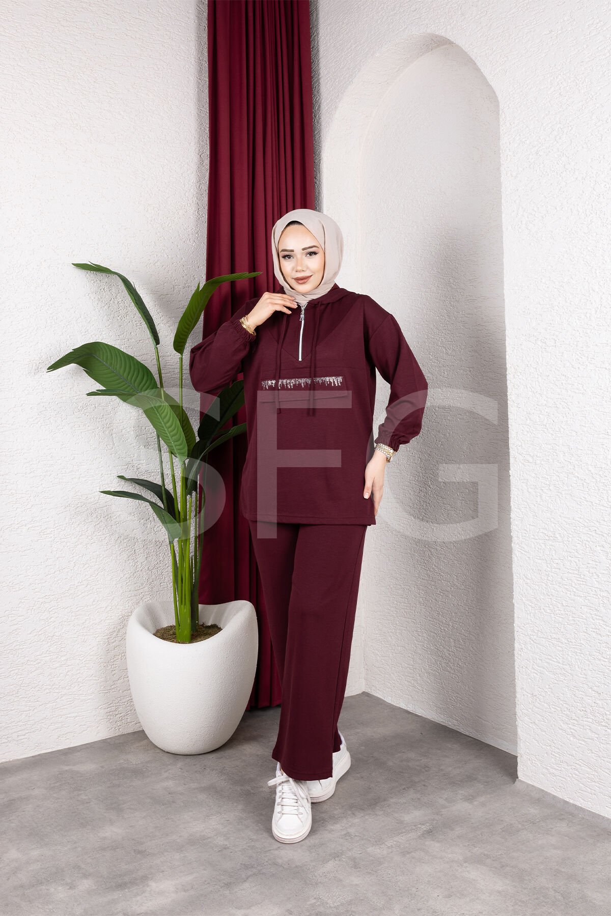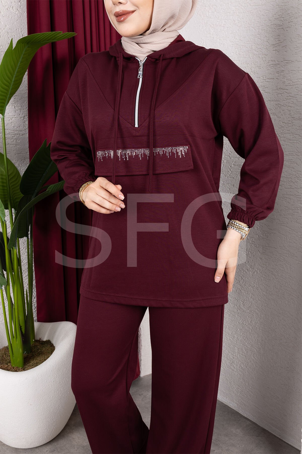 Kadın Tesettür Giyim Fermuarlı Taşlı Cep Kapaklı Kapşonlu & Pantolon İkili Takım (4'lü)