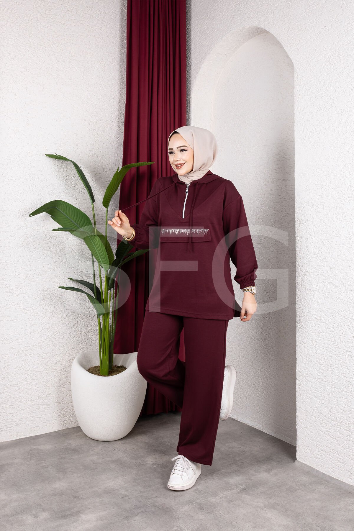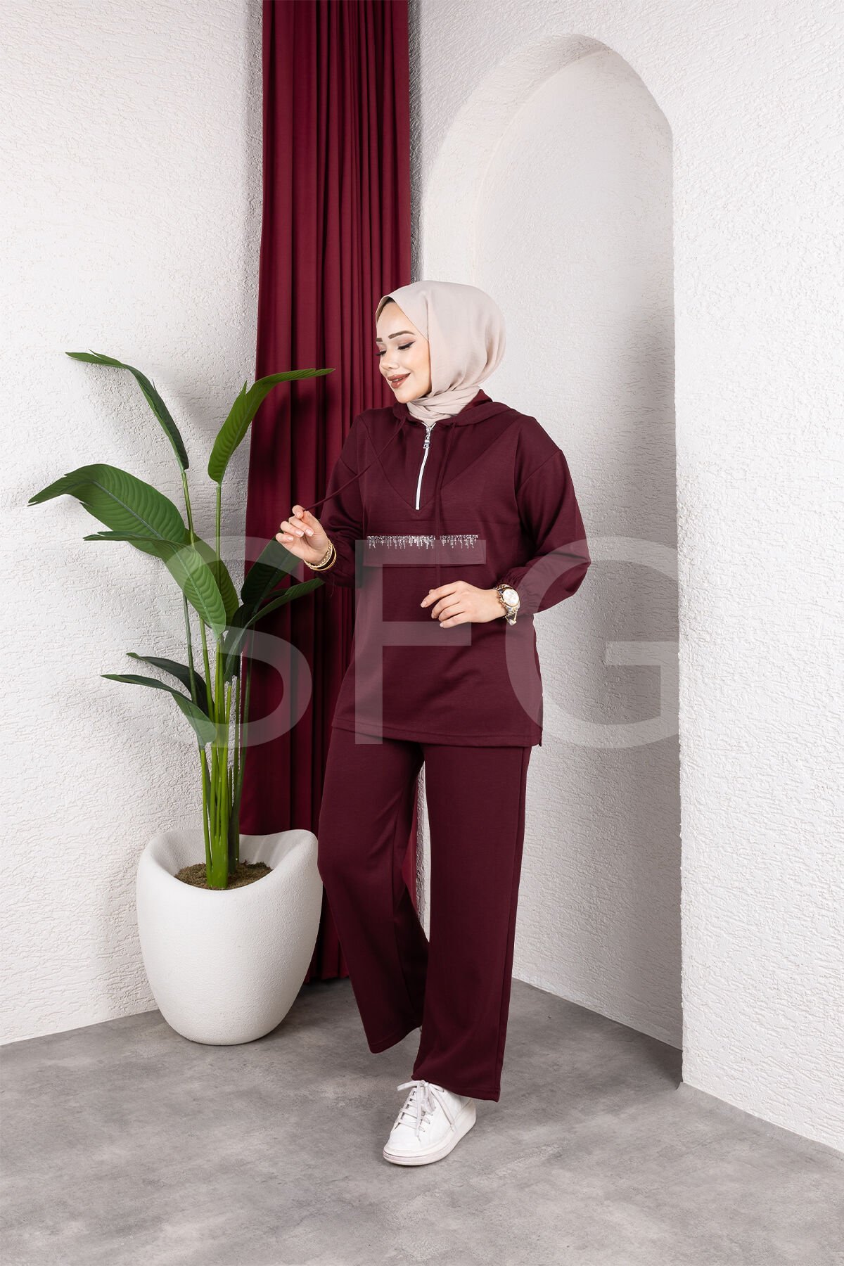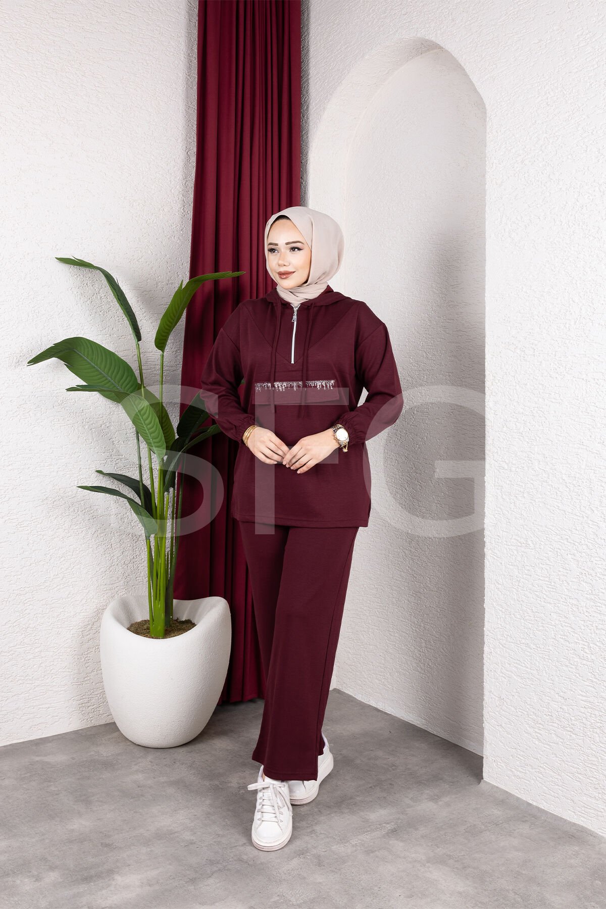 Kadın Tesettür Giyim Fermuarlı Taşlı Cep Kapaklı Kapşonlu & Pantolon İkili Takım (4'lü)