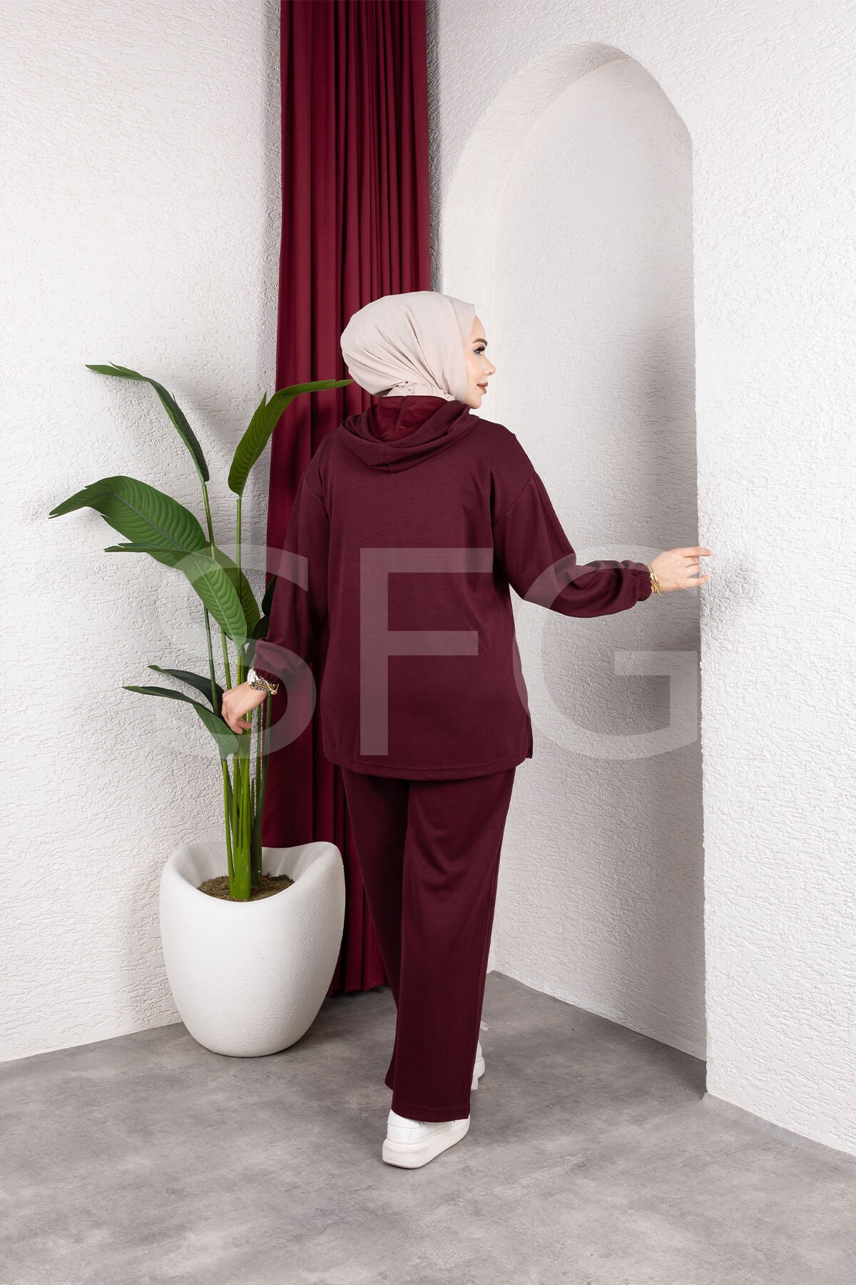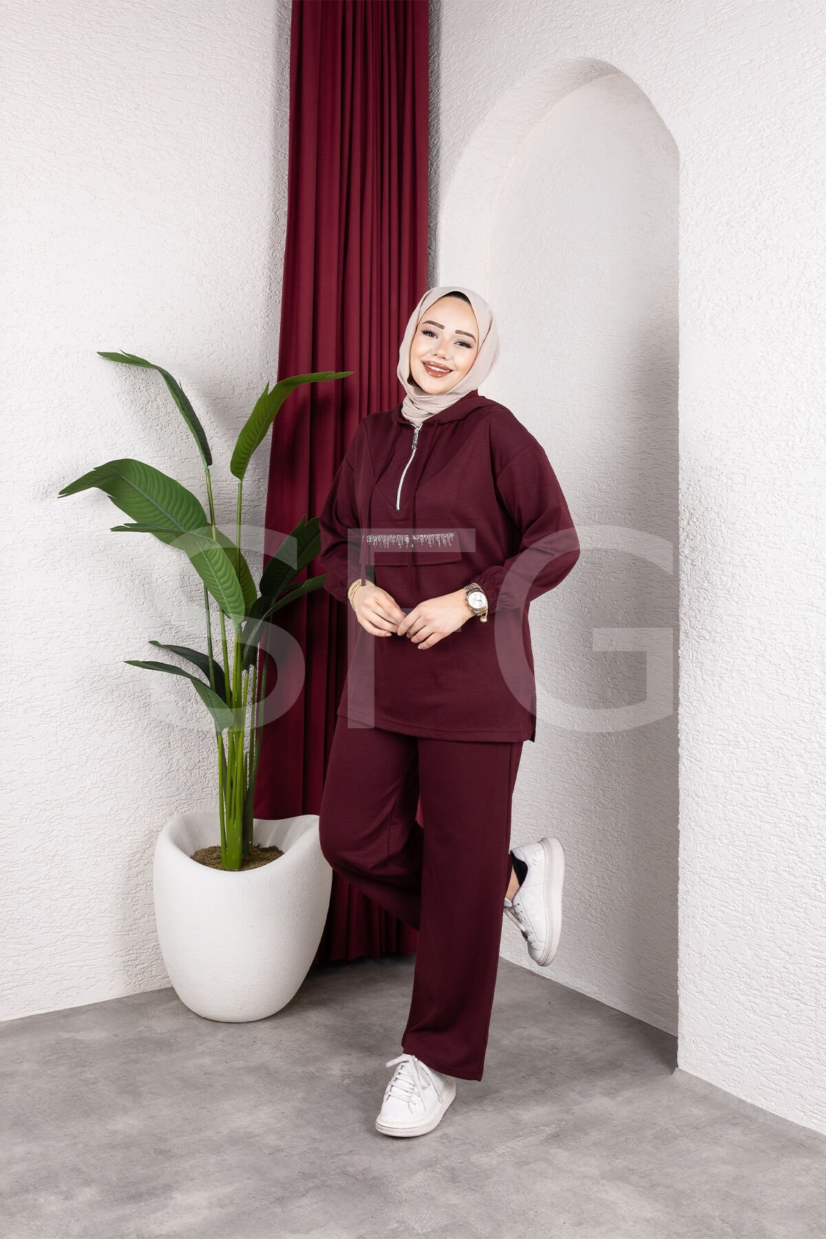 - Tüm mevsimlerde rahatlıkla tercih edilebilen, 2 iplik dokuma kumaştan üretilmiş tesettür giyim takımı.; - Geniş paça tasarımı ile modern ve şık bir görünüm sunar.; - Tunik ve pantolon olmak üzere iki parçadan oluşan bu takım, pratik kullanım sağlar.; - Standart kol tipi ve uzun kollu tasarım, konforlu bir kullanım sunarken tarzınızı yansıtır.; - Kapüşonlu yaka tipi ile hem stil sahibi hem de fonksiyonel bir görünüm kazandırır.; - Lastikli bel tasarımı sayesinde rahat bir oturuş sağlar ve farklı vücut tiplerine uyum gösterir.; - Yırtmaç detayı ile hareket özgürlüğü sunarken, düz desen ve oversize kalıp modern bir siluet oluşturur.; - Kutu içermeyen paket içeriğiyle çevre dostu bir tercih yapmanızı sağlar.; - Türkiye'de üretilmiş olup, yerel kaynaklardan elde edilen malzemelerle sürdürülebilirliği destekler.; - Yarım pat düğme kapama şekli kolay giyilip çıkartma imkanı sunarken, cepsiz tasarım minimalist bir şıklık katmaktadır.; - Taş baskı tekniğiyle zenginleştirilmiş detaylar