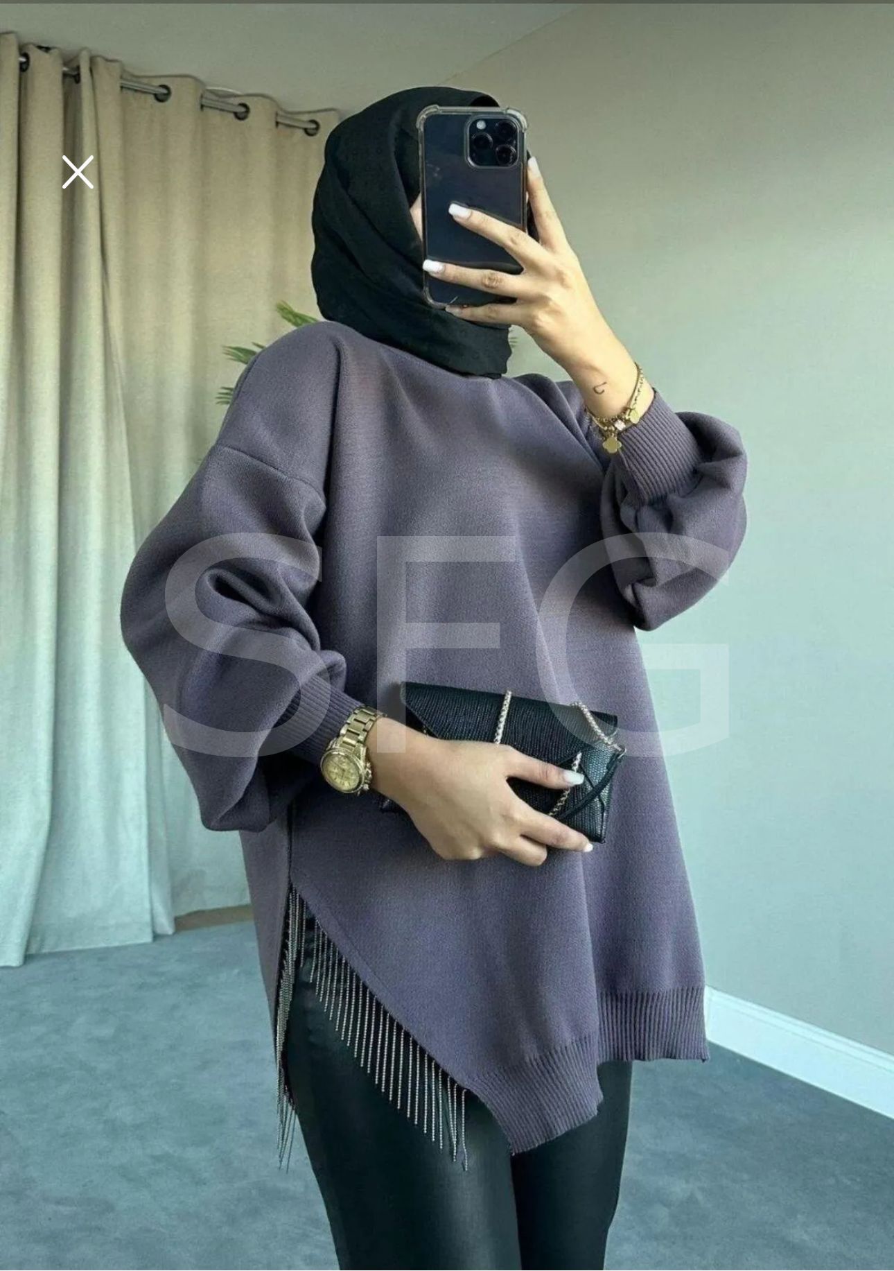 Kadın Testtür Giyim Bisiklet Yaka Yırtmaç Taşlı Balon Kollu Oversize Triko Tunik (3'LÜ)