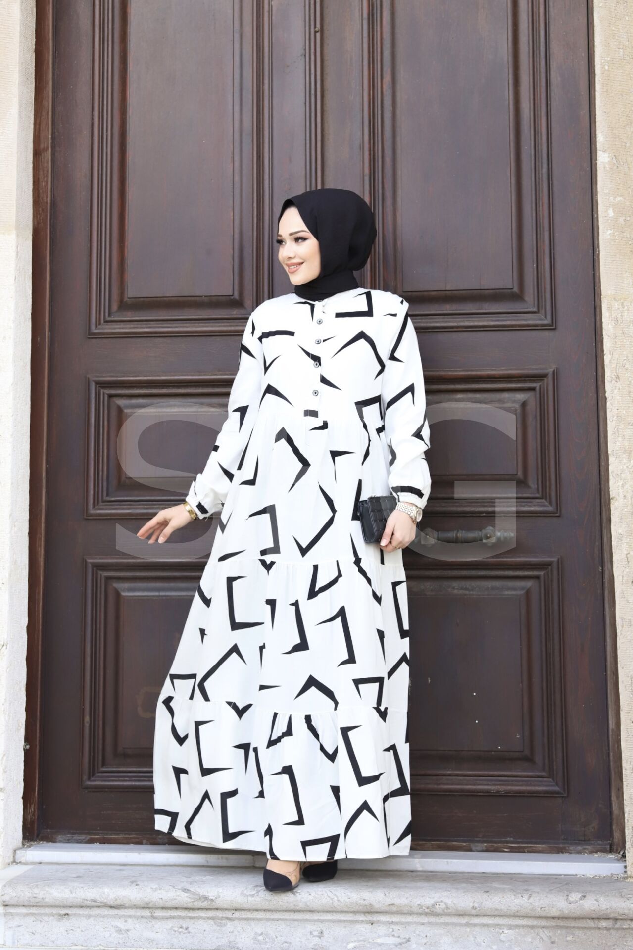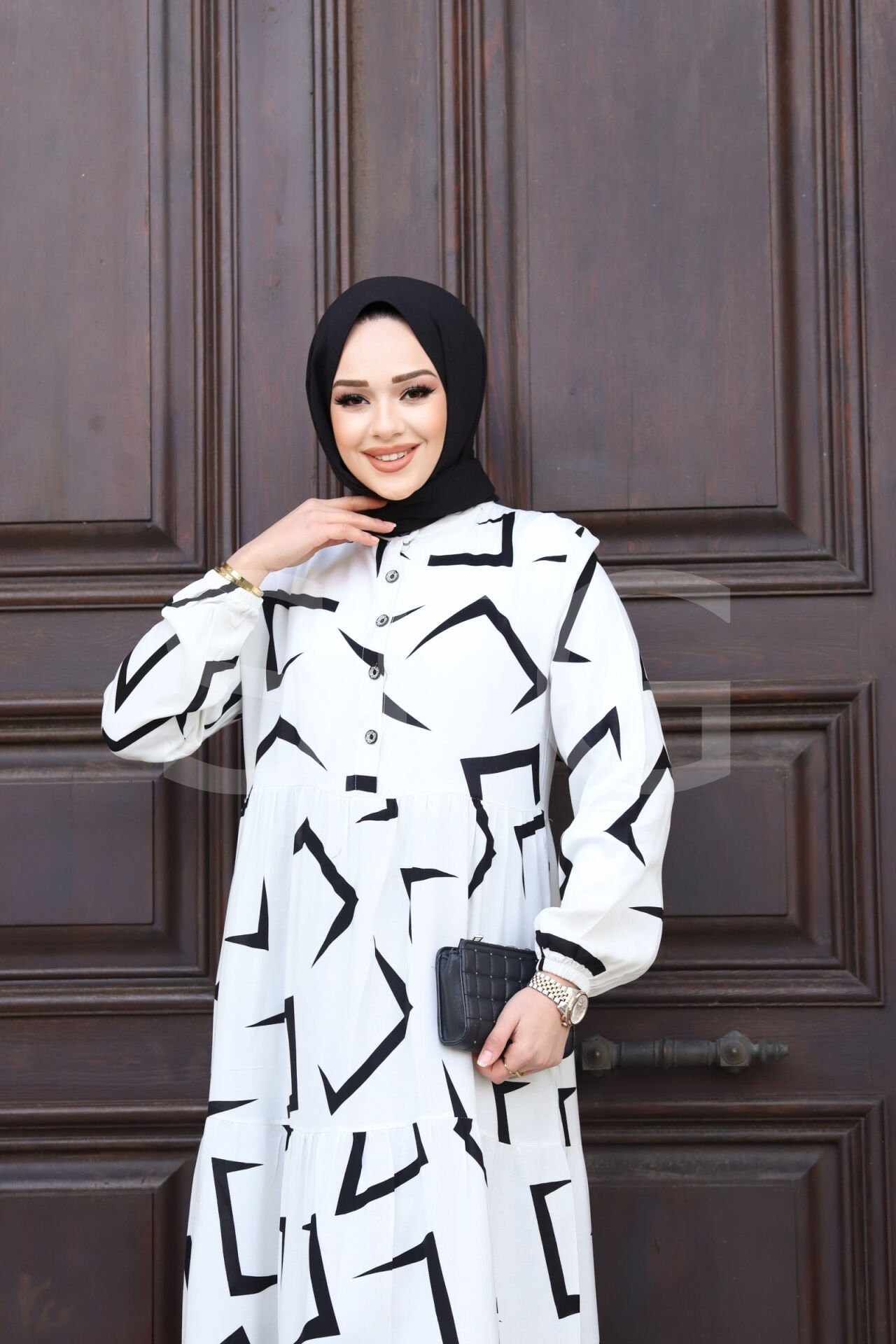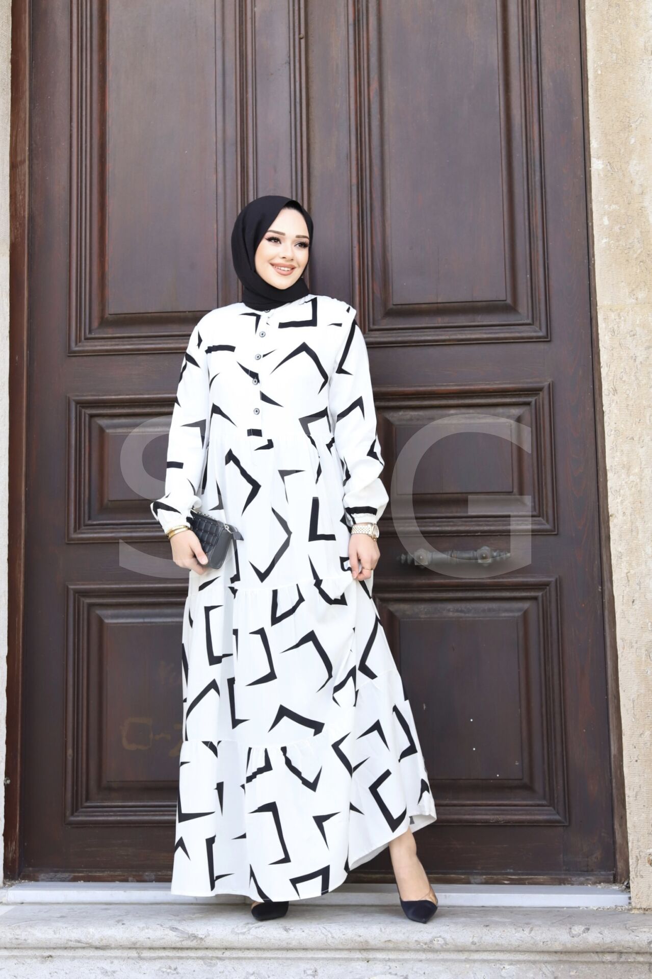 KADIN YAZLIK TESETTÜR ÖNÜ DÜĞMELİ OK DESENLİ DOKUMA VİSKON ŞIK ELBİSE (4'LÜ)