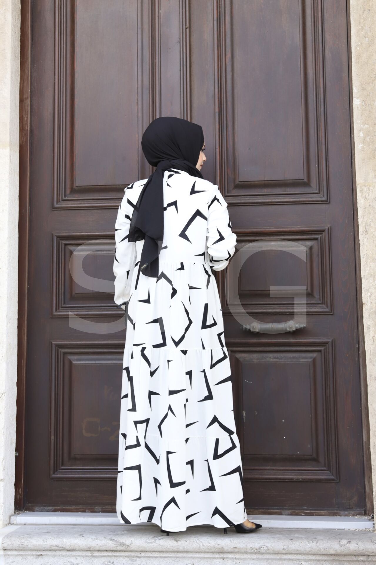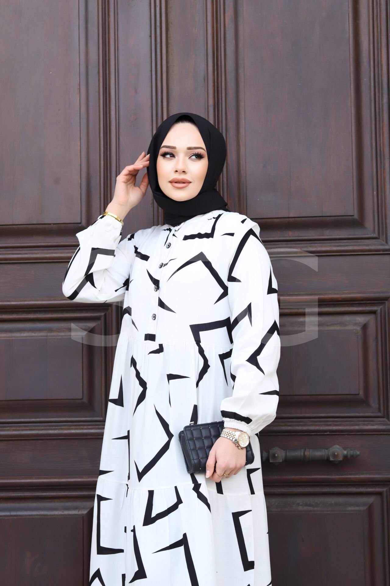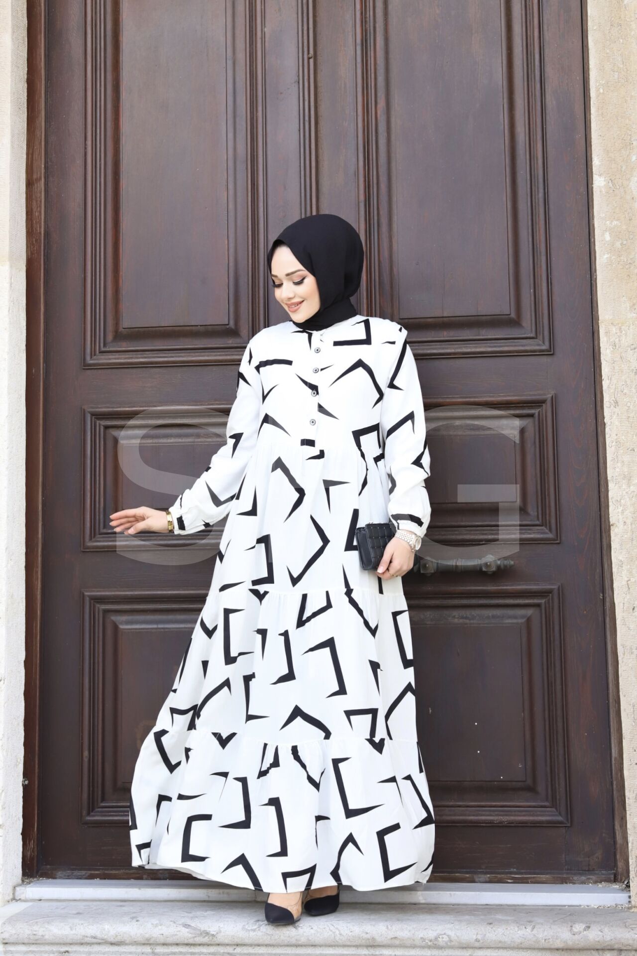 KADIN YAZLIK TESETTÜR ÖNÜ DÜĞMELİ OK DESENLİ DOKUMA VİSKON ŞIK ELBİSE (4'LÜ)